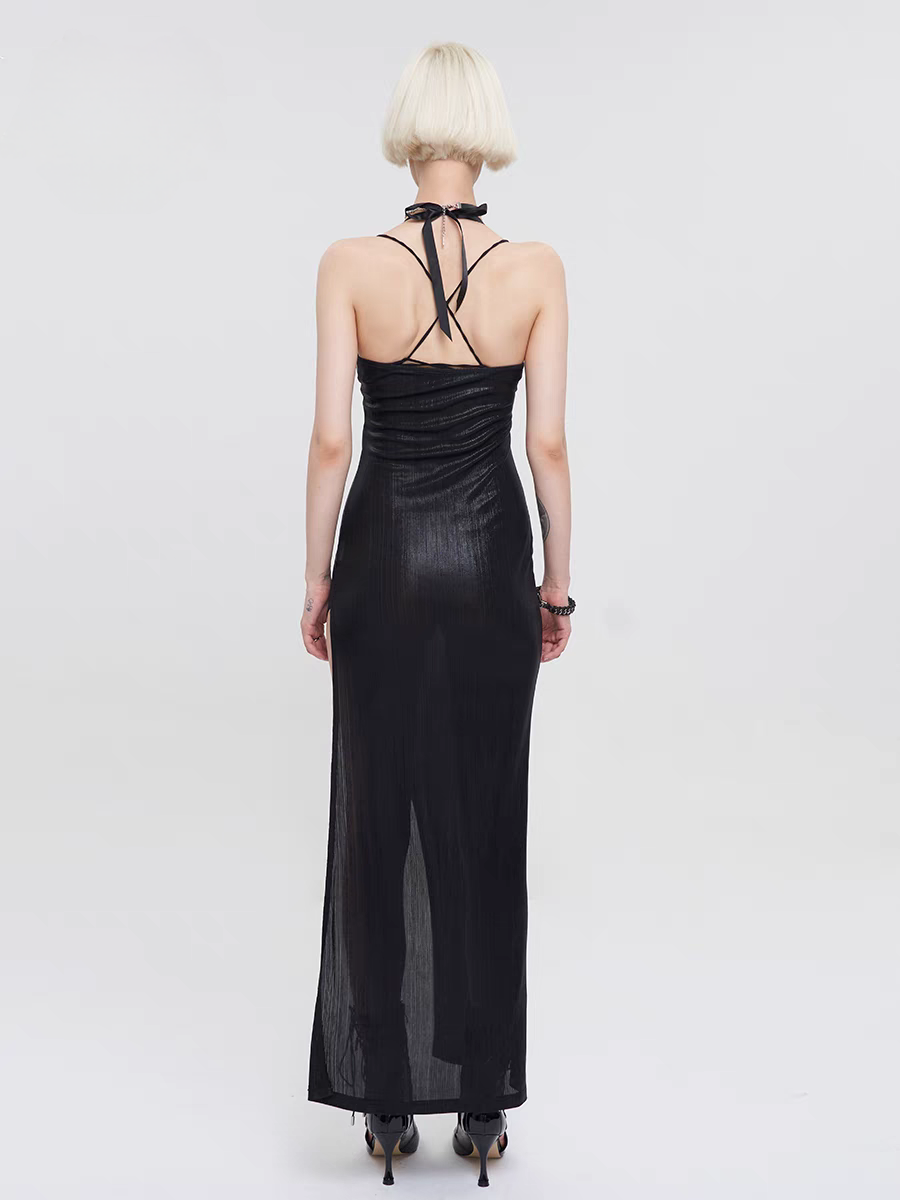 💃 The stretch halter design accentuates the swan neck and straight shoulders, with the exposed area at the back of the neck calculated to the perfect threshold that is "tempting but legally exempt". 💗💗💗💗 The high slit skirt cuts the legs in the golden ratio, and the shadows between steps are sliced into the same menacing aura as in "Kill Bill". Paired with Dr. Martens boots, it directly activates the "Cyber Female Warrior" skin. 🔥🔥